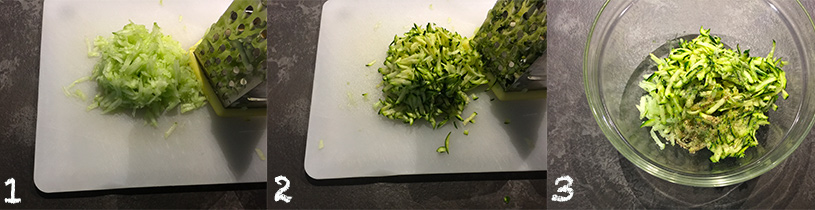 - Mondiamo e laviamo la zucchina. Grattugiamola con la grattugia a fori larghi e la strizziamo per eliminare l'acqua di vegetazione.