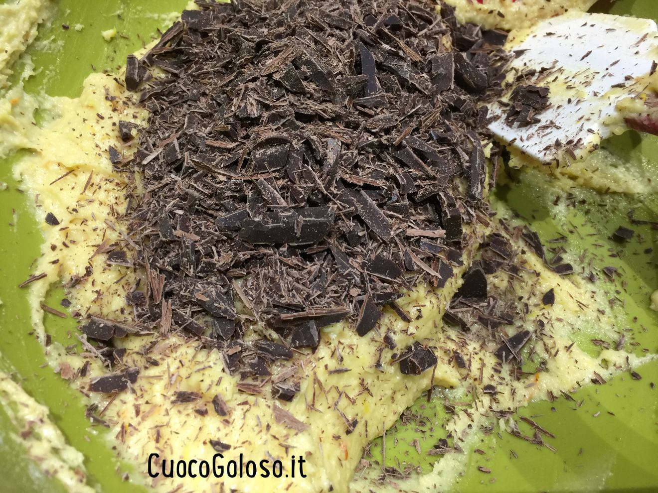 Ora prendiamo il cioccolato e con l’aiuto di un coltello affilato, lo riduciamo in scagliette (potete utilizzare anche le gocce di cioccolato già pronte), aggiungiamolo all’impasto ed amalgamiamolo.