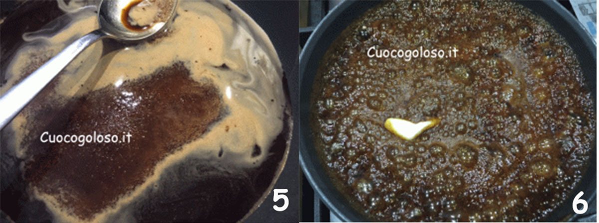 Pesiamo in un pentolino il caffè espresso, lo zucchero e il caffè solubile e trasferiamo sul fuoco. Portiamo il composto a bollore fino alla creazione di un caramello al caffè. Quando buona parte del liquido sarà evaporato e il caramello inizierà ad addensarsi, uniamo il burro e mescoliamo con un cucchiaio di legno. A questo punto la nostra glassatura sarà pronta.