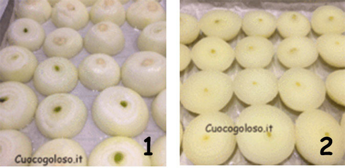 Sbucciamo e laviamo le cipolle, le tagliamo a metà in orizzontale e le adagiamo su di una teglia con carta da forno con la parte piatta verso il basso (1). Versiamo due bicchieri d’acqua ed infornate a forno già caldo a 200°C per 30 minuti. Trascorso il tempo le sforniamo e capovolgiamo (2).
