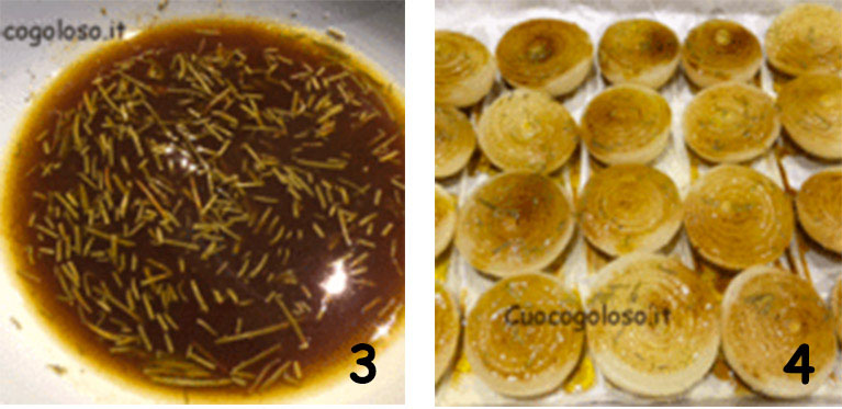 In una ciotola mettiamo l’olio, la salsa di soia, la salsa Worcester, il pepe nero, il sale, la senape e gli aghi del rosmarino tagliuzzati grossolanamente (3). Mescoliamo il tutto con una forchetta. Con l’aiuto di un cucchiaio versiamo l’intingolo su ciascuna cipolla (4).