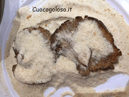 Nel frattempo prepariamo un vassoio e ci versiamo dentro il pane grattato. Scoliamo dall’uovo poche alla volta le nostre “bistecche” di pleurotus