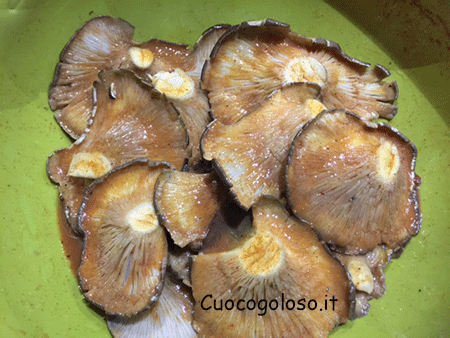 Laviamo velocemente i funghi sotto acqua corrente per portare via polvere ed eventuali residui di terra e li mettiamo a scolare.
