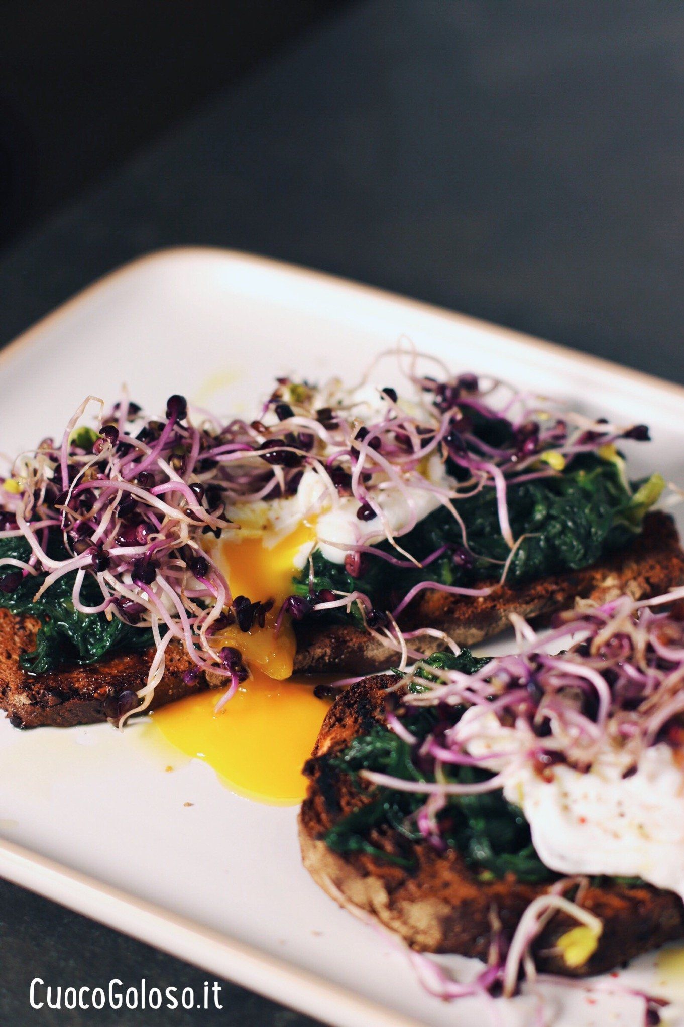 Componiamo il piatto. Adagiamo sulle fette di pane un bel letto di agretti fatti scaldare in microonde, ricordiamoci di lasciare un posto centrale dove adageremo l’uovo pochè. Aggiungiamo i germogli ben stesi sopra le uovo.