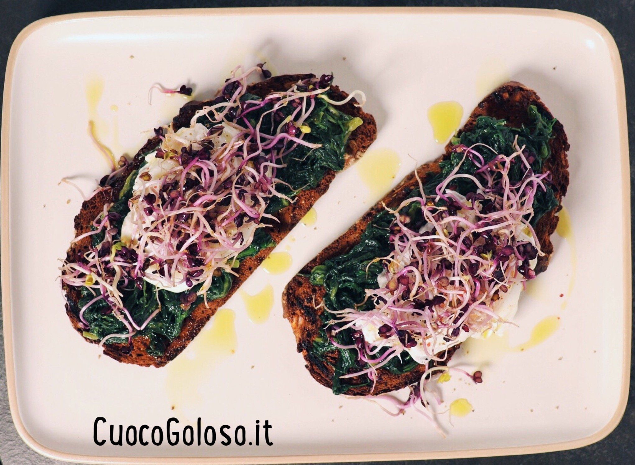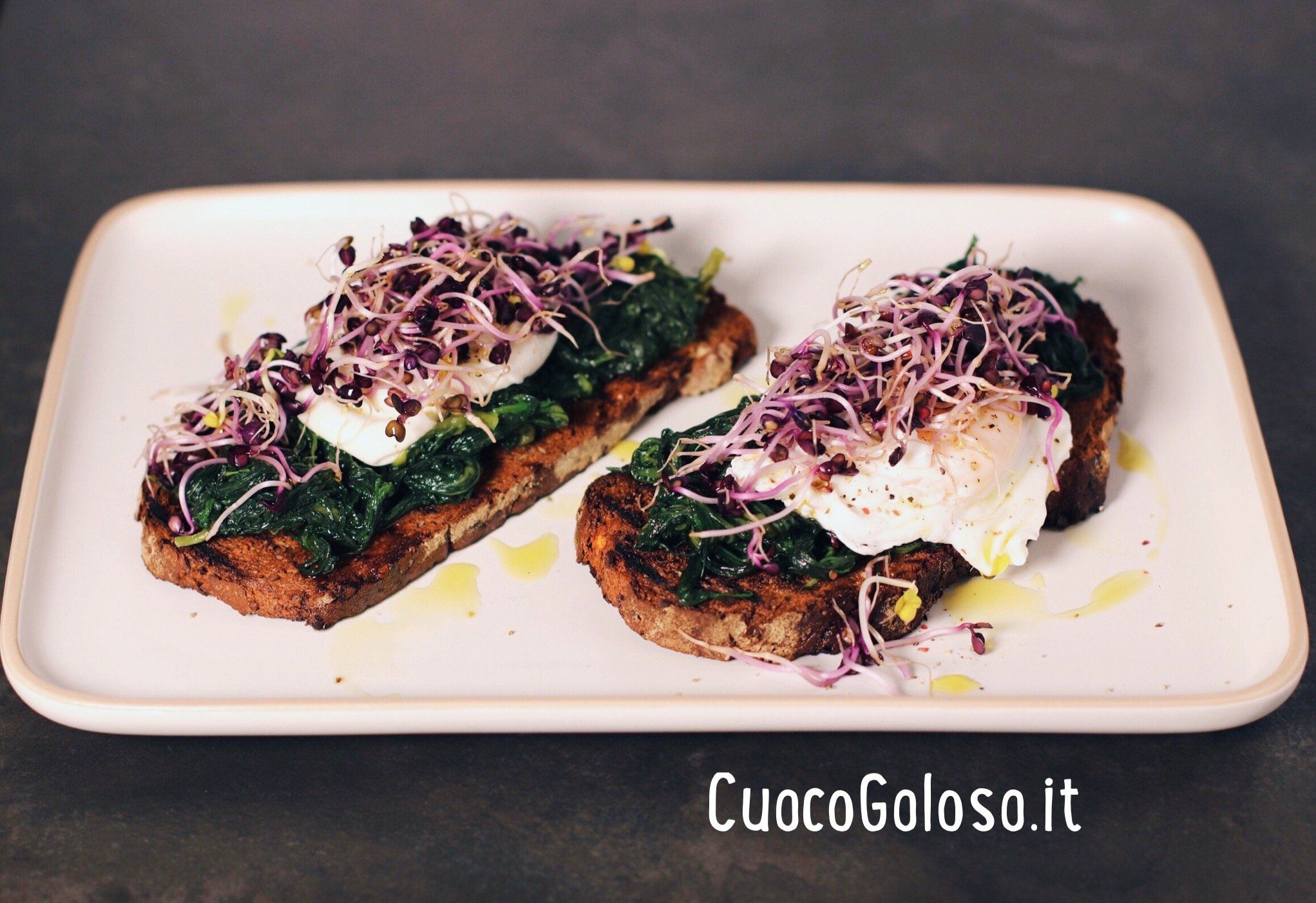 I Crostone con Agretti, Uovo Pochè e Germogli di Ravanello Rosso sono un piatto sfizioso, colorato e golosamente completo, merita d’essere assaggiato….