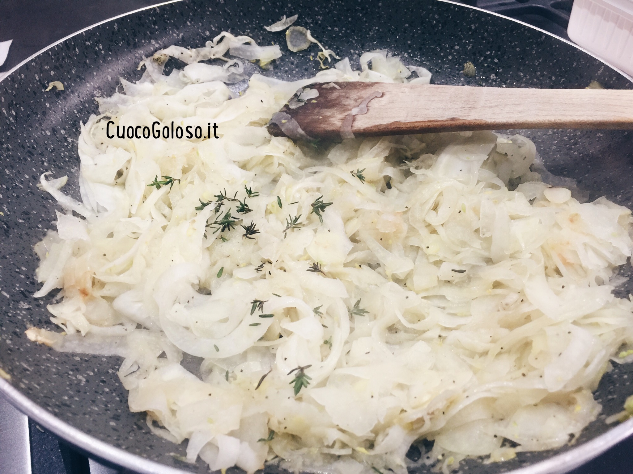 In una padella antiaderente mettiamo 15ml C842F19B-4849-46F4-9898-8AC4D0C629ED-150x150 Fazzoletti di Prosciutto Cotto con Finocchi filantid’olio, uniamo i finocchi, saliamo, pepiamo ed aggiungiamo le foglioline di timo, facciamo appassire, aggiungiamo mezzo bicchiere d’acqua e copriamo con il coperchio. Andremo ad asciugare il liquido dei finocchi solo quando saranno mosci e cotti.