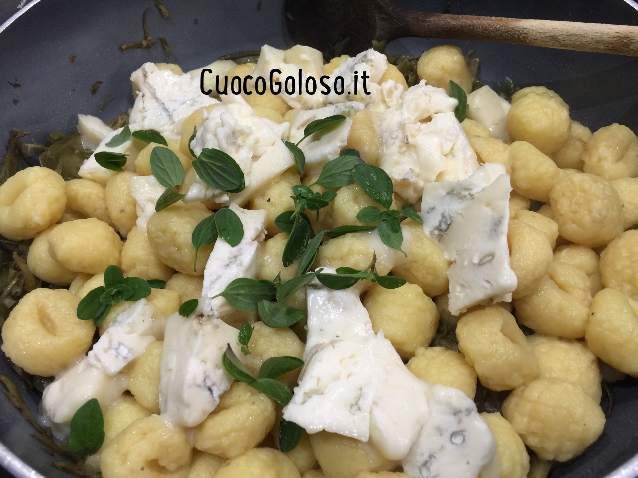 Quando gli gnocchi saranno pronti, li scoliamo e versiamo nella padella con la salsa, aggiungiamo il gorgonzola e saltiamo. Con il calore il gorgonzola fonderà e legherà il tutto.