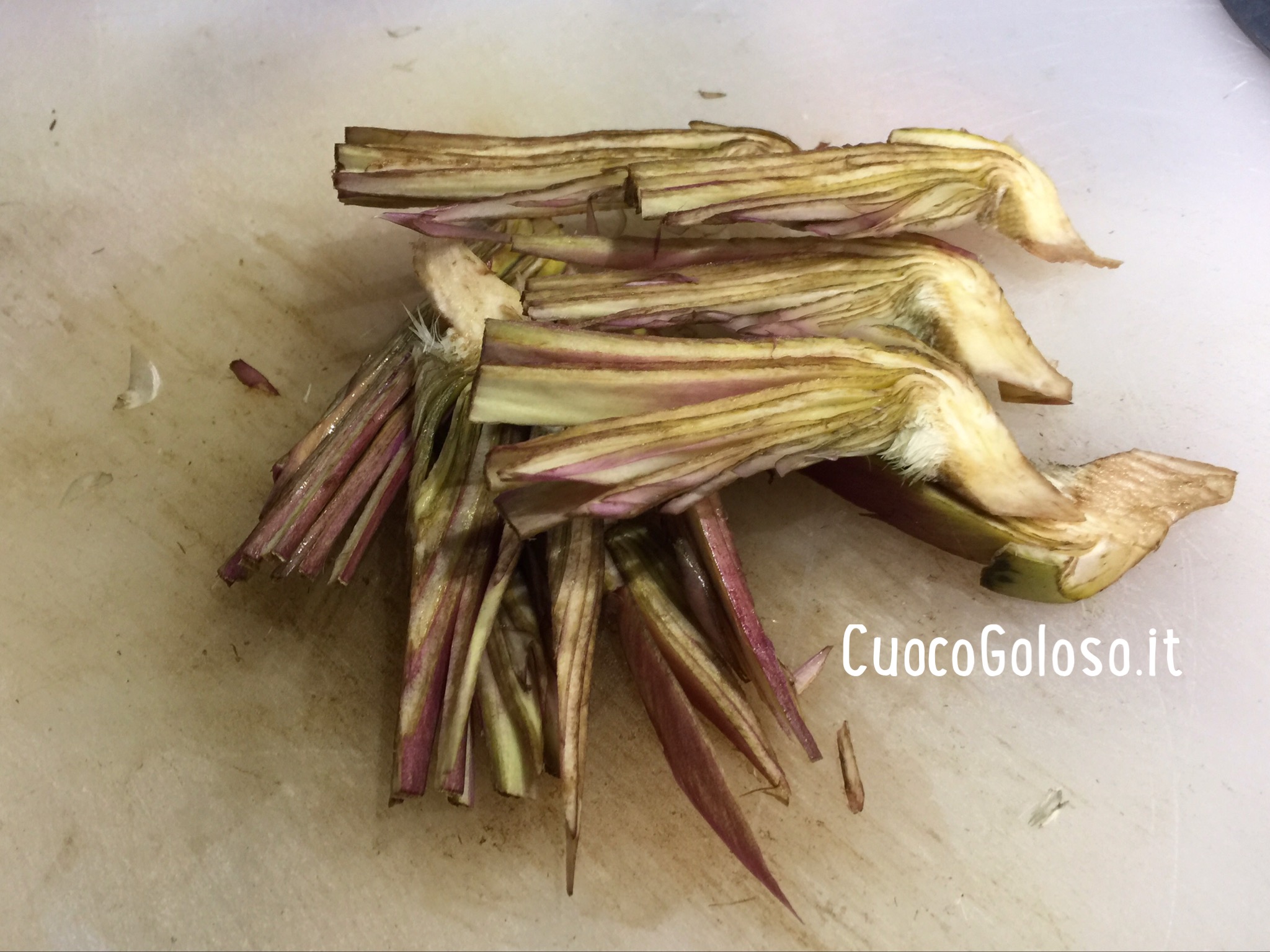 Mondiamo i carciofi togliendo le foglie dure, pulenti il gambo ed eliminando la peluria interna.