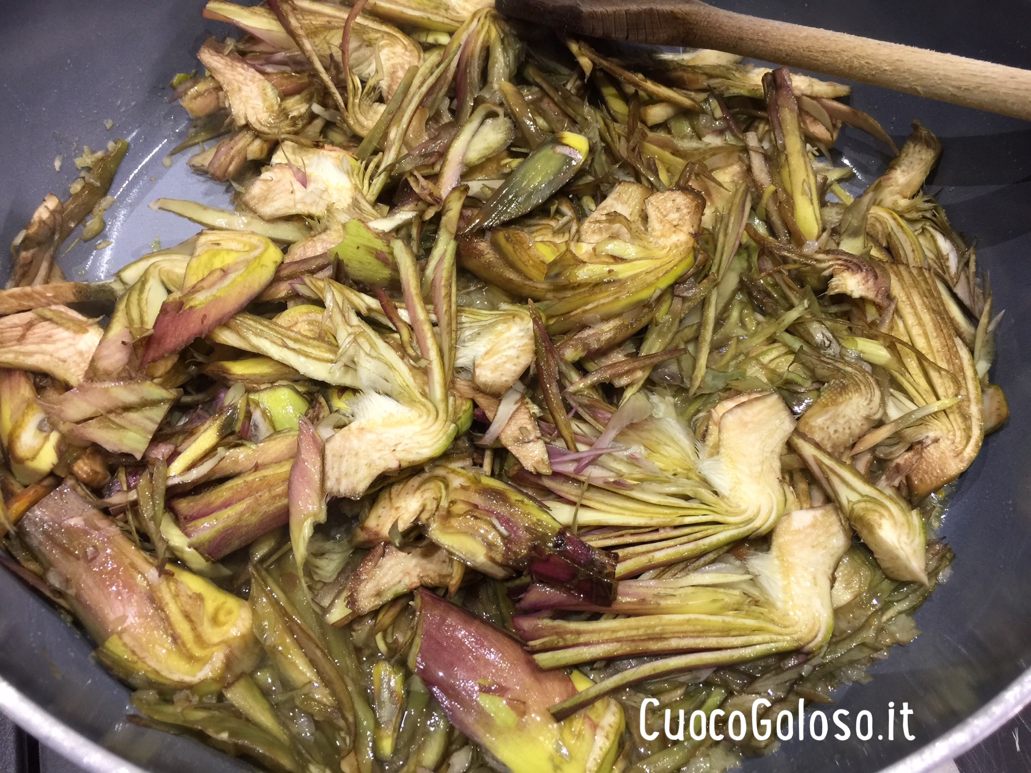 In una padella facciamo rosolare in olio lo scalogno, aggiungiamo i carciofi, saliamo e pepiamo, aggiungiamo mezzo bicchiere d’acqua e facciamo stufare a fuoco basso e coperto col coperchio.