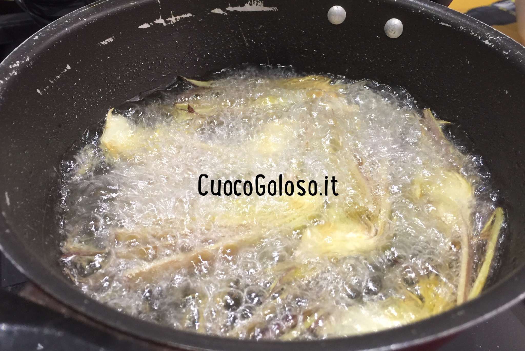 Friggiamo i carciofi fino a doratura, scoliamo, adagiamo su della carta assorbente e saliamo.