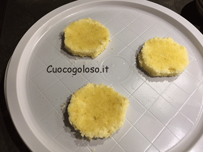 Mettiamo 3 dischetti di pan di spagna su un tagliere o su di un vassoio.