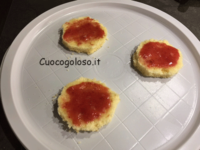 aggiungiamo circa 10gr di confettura di fragole e la spalmiamo per tutta la superficie.