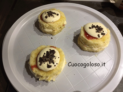Siate generosi, deve essere ben ricoperta. Ripetiamo l’operazione anche per le altre tortine ed una volta pronte le posizioniamo sul piatto da portata.