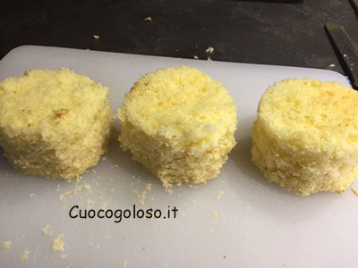 Ogni cilindro va tagliato in orizzontale ricavando 3 dischi di pan di spagna.