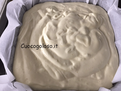 Una volta che avremo aggiunto tutte le farina, versiamo l’impasto in una taglia rivestita con carta da forno.