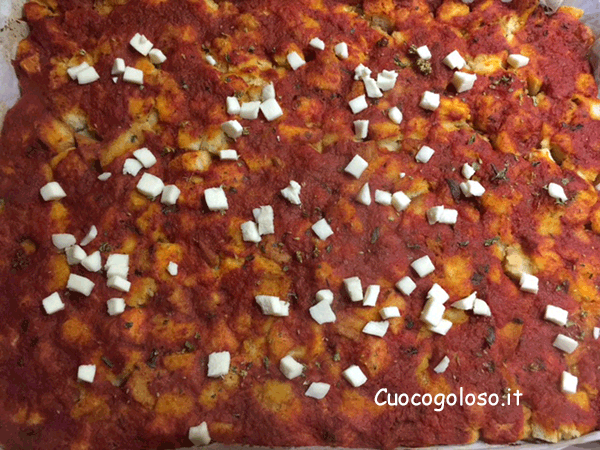 Quando la salsa sarà pronta la distribuiamo sulla base in modo uniforme e spolveriamo con l’origano.