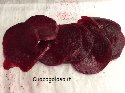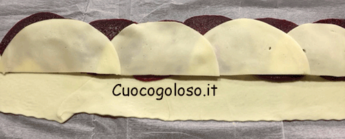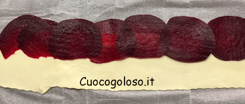 Prendiamo una striscia di pasta sfoglia e a partire dalla metà, stendiamo le fette di rapa rossa, saliamo