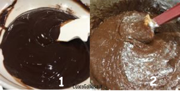 Iniziamo subito la nostra preparazione facendo fondere a bagnomaria o in microonde il burro con il cioccolato fondente spezzettato. Successivamente montiamo le uova con 180gr di  zucchero, fino ad avere una massa gonfia e spumosa.