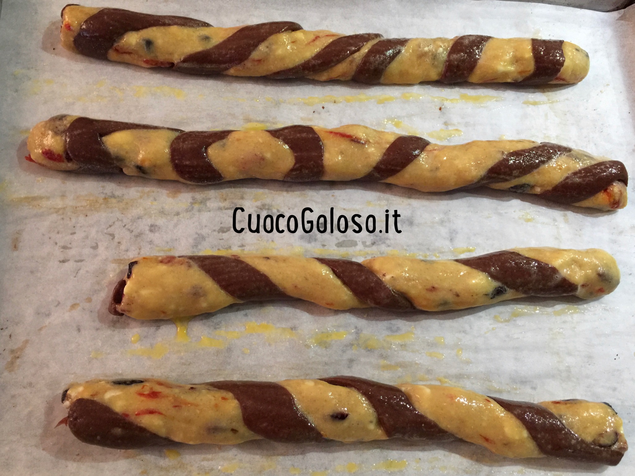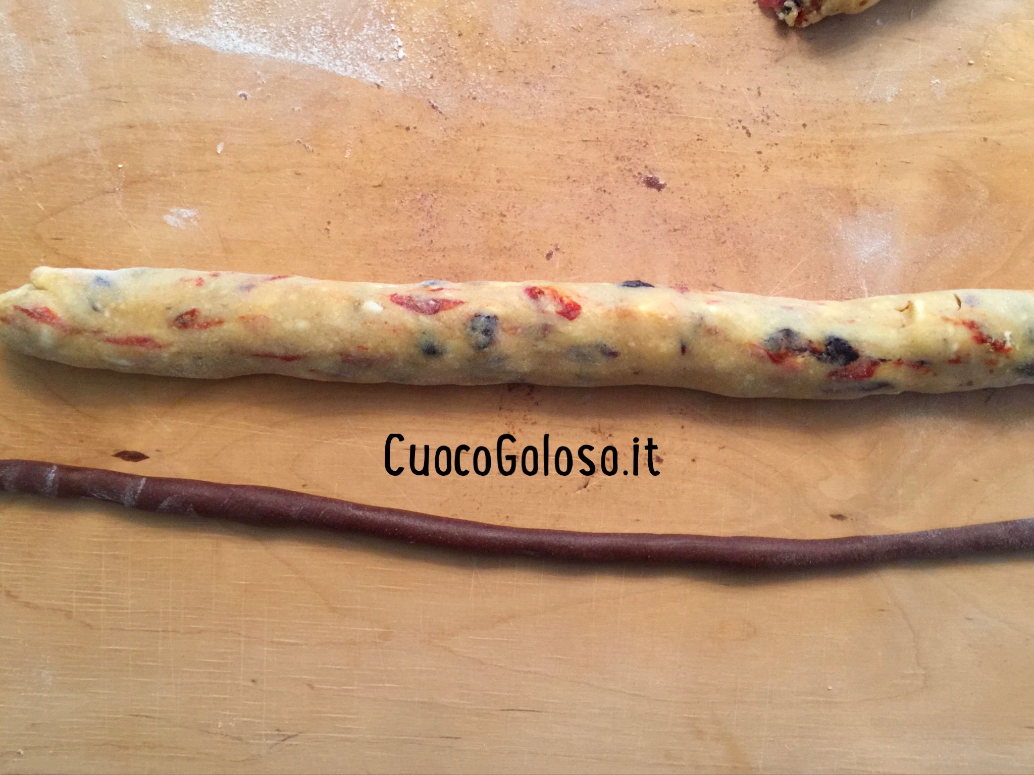 Prendiamo l’impasto chiaro e l’allunghiamo formando dei filoni da circa una trentina di centimetri.