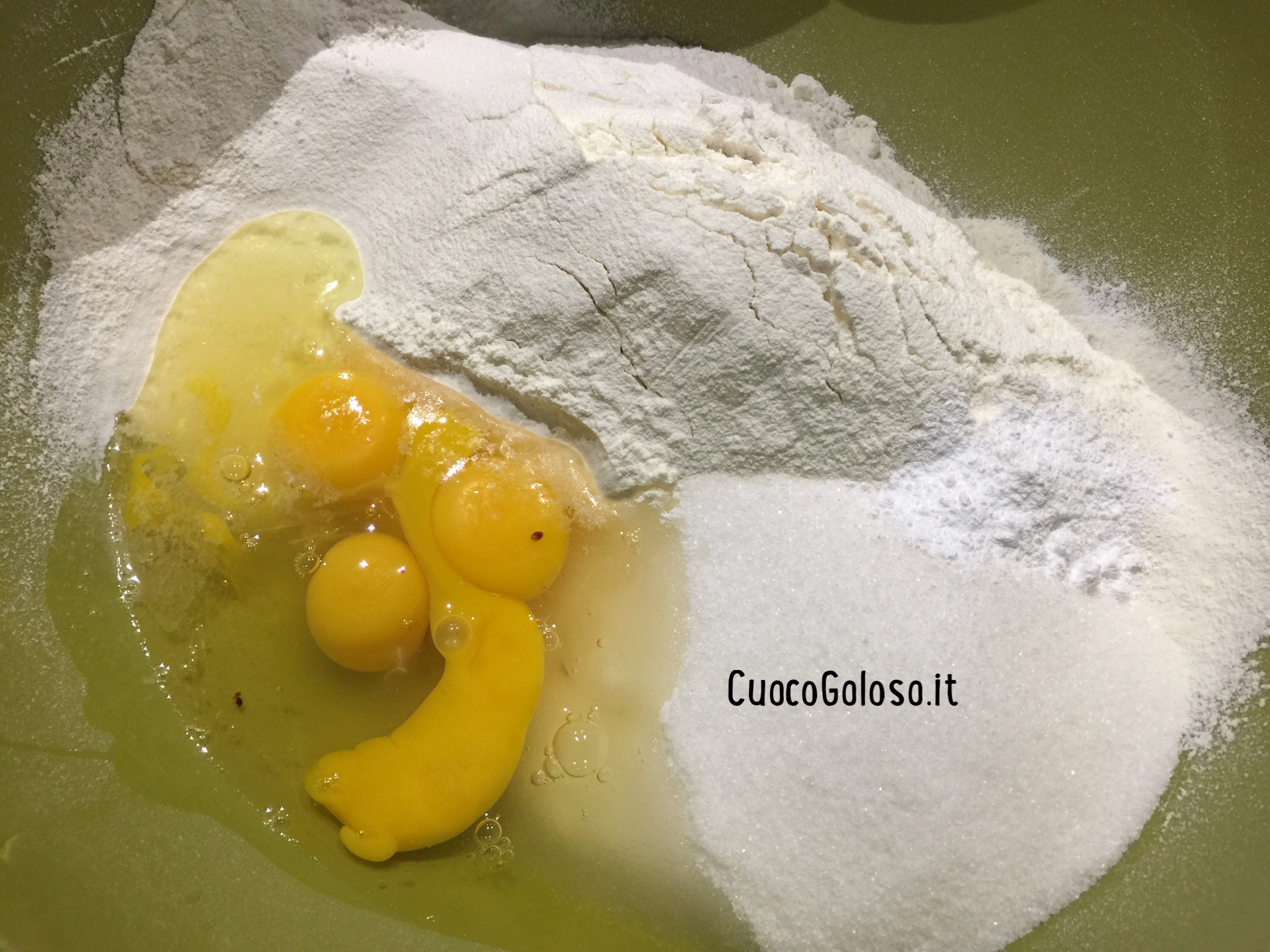 In una capiente ciotola setacciamo la farina ed il lievito, aggiungiamo lo zucchero, le uova ed il sale.